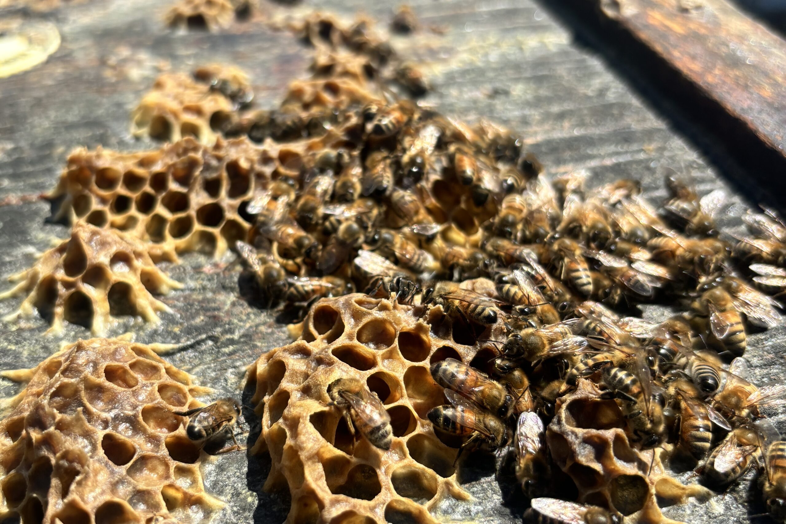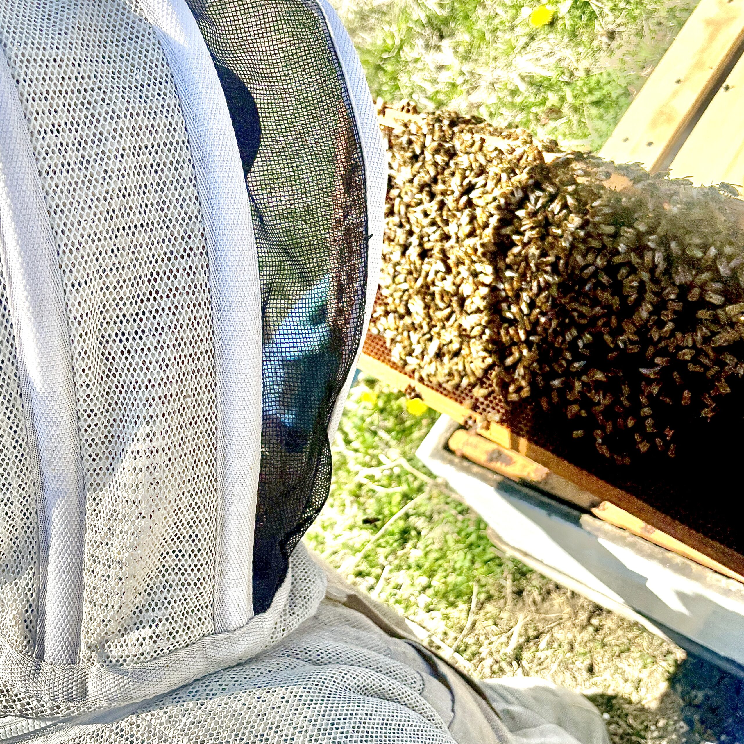 As he moved through the motions I got to jump in and help handle some of the bees, I learned they very much dislike their hive to be rattled, pounded on or tapped on. They get all sorts of riled up. It’s insanely disturbing feeling them ram into the mesh face shield. All the while I’m telling myself, you’re protected, you’re ok. But little by little I can feel the brass shrinking.